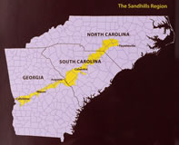 The Sandhills region extends unbroken from central North Carolina through middle South Carolina into east-central Georgia, then as scattered patches to west-central Georgia. It is the innermost portion of the Coastal Plain, but its rolling hills contrast sharply with the flat terrain of the coast. Its geology is obviously different from both the Coastal Plain and the Piedmont, thus its habitats are different, perhaps unique.