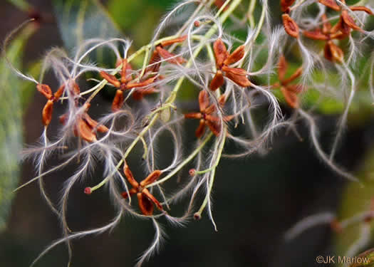 Fruit a cluster of achenes with long curved feather-like tails (styles), per Woody Plants of the Blue Ridge (Lance).
