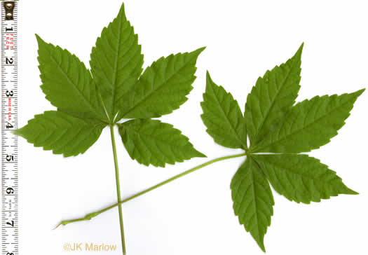 5(3-7) ovate to elliptic to obovate leaflets, margins serrate above middle, per Forest Plants of the Southeast and Their Wildlife Uses (Miller & Miller, 2005).