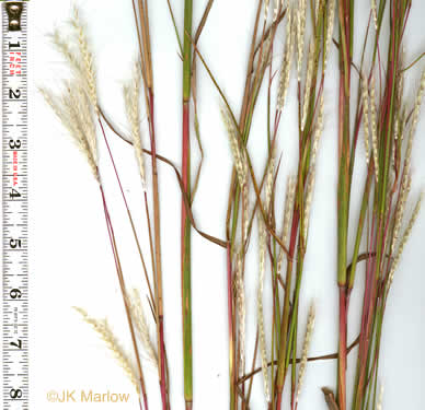 Spikelets yellowish-brown, ~ 7mm long, pilose, with densely bearded callus, per Manual of the Grasses of the United States (Hitchcock & Chase, 1950).