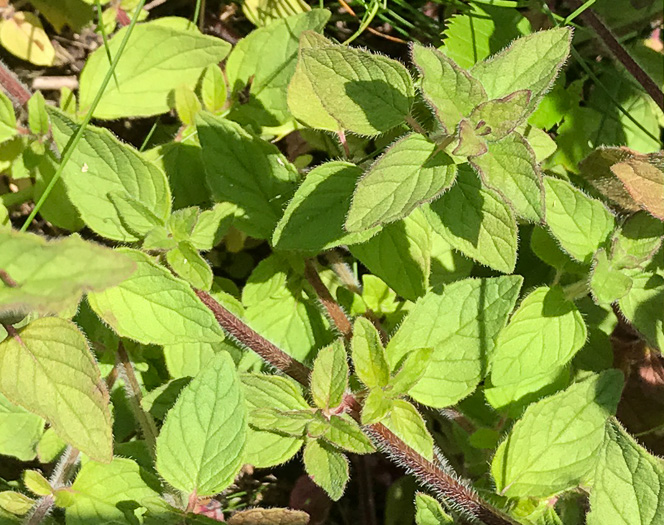 Leaves short-stalked, mostly rhombic-ovate; crenate from widest point to tip, per Wildflowers of Tennessee (Carman, 2005).
