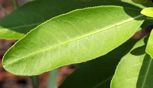 Leaves leathery, oval to elliptic, to 3cm long, margins revolute, crenate, per Native Shrubs and Woody Vines of the Southeast (Foote & Jones, 1989).