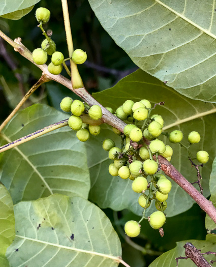 Fruit spherical 1-seeded drupes, hanging down in fanned clusters, per A Field Guide for the Identification of Invasive Plants in Southern Forests (Miller, Chambliss, & Lowenstein, 2010).