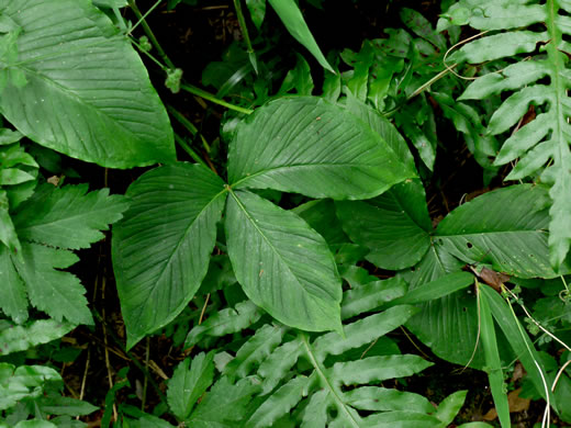 Heavily ribbed oval leaves up to 12" long, sessile or somewhat clasping, per Wildflowers of the Southern Mountains (Smith, 1998).
