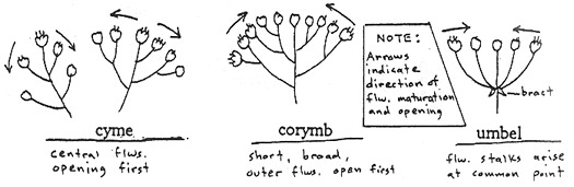 Inflorescences: Flowers occurring in groups or clusters are arranged in some particular form called an inflorescence. Bracts are often seen on flower stalks within, or on basal areas of inflorescences. Some common inflorescence types of woody plants are: