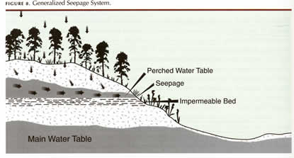 Fens are wetlands that harbor an open, herb-dominated community, and receive water from rain and from seepage. Seepages are not plant communities per se. Seepage refers to a water source, which can allow wetland communities like a fen to develop. Seepage occurs when rainwater penetrates the soil to an impermeable layer (such as a clay hardpan). The water then moves laterally through the soil over this impermeable layer. Where the soil slopes so that the impermeable layer is exposed at the surface (outcrops), water seeps out of the soil and flows down the slope. The water picks up dissolved minerals from the soil, which contribute to the mineral supply of the seepage. Figure 8 illustrates a generalized seepage system.