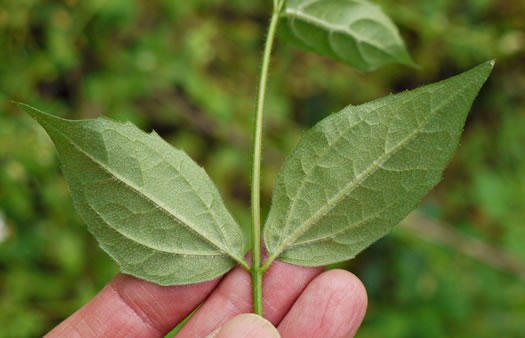 Leaves prominently 3-nerved, hirsute beneath, acute or acuminate, per Native Shrubs and Woody Vines of the Southeast (Foote & Jones, 1989).