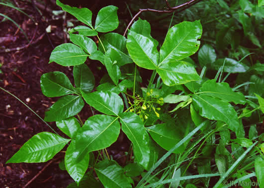 Terminal leaflet sessile, thus different from Poison Ivy and Poison Oak, per Trees of the Southeastern United States (Duncan & Duncan, 1988).