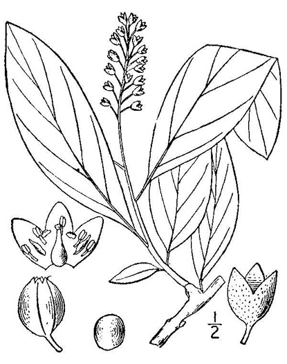 Inflorescence an erect terminal spike with greenish apetalous flowers, per Wildflowers & Plant Communities of the Southern Appalachian Mountains and Piedmont (Spira, 2011).