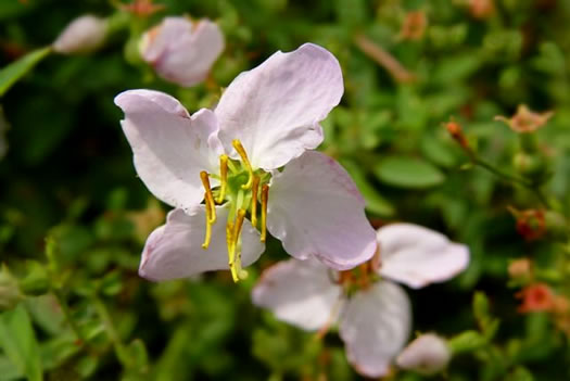 Petals pale pink (to white); stamens 8, with prominent curved yellow anthers, per Wildflowers of Tennessee (Carman, 2005).