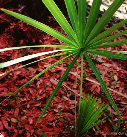Leaves upright, fan-like, nearly circular in outline, per Forest Plants of the Southeast and Their Wildlife Uses (Miller & Miller, 2005).
