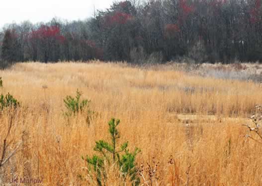 The Red Maples provide a hint of red in the early-Spring grey treeline.