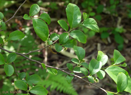Leaves narrowly elliptic to ovate or obovate, usually 2-8cm long, per Weakley's Flora.