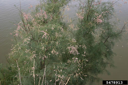 The salt cedars bear tiny, overlapping scalelike leaves about 1/16" long, per Invasive Plants, Guide to Identification, Impacts and Control (Kaufman & Kaufman, 2007).