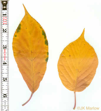 Leaves broadly ovate to obovate, narrowed to a slender point at apex, per Manual of Woody Landscape Plants (Dirr, 1975+).