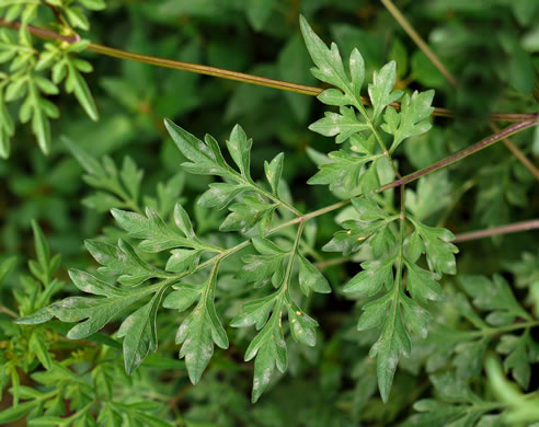 Fern-like leaves are 2-3x pinnately dissected into irregular segments, per Wildflowers of Tennessee (Carman, 2005).