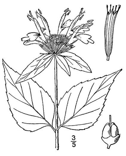 The flower cluster at the top of the stem or a branch has numerous bright purple flowers, in the typical Monarda shape, and about 10-20 in bloom simultaneously. Though the flower color will separate this species from M. didyma, M. clinopodia, M. austroappalachiana, and most individuals of M. fistulosa, there is one scarce variety of the last species (var. rubra) that also has purple flowers. However, M. fistulosa leaves tend to be lanceolate, usually about 1-inch wide or less, and they are about 3 times as long as wide, rather than 2 times as long as wide in M. media. Read more at Vascular Plants of North Carolina.