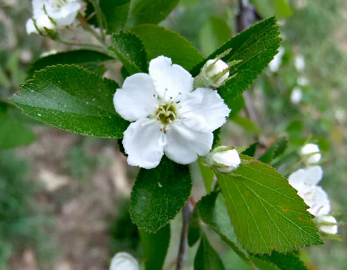 Sepals glandular-serrate; inflorescence usually pubescent, 3-8 flowered, when lvs ~ half-grown, per Haws: A Guide to Hawthorns of the Southeastern US (Lance, 2014).