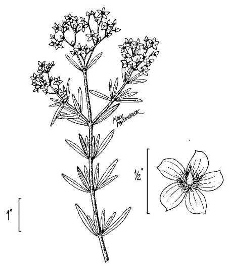 Flowers with 5 quarter-inch petals, borne in a showy cymose inflorescence, per Atlantic Coastal Plain Wildflowers (Nelson, 2006).