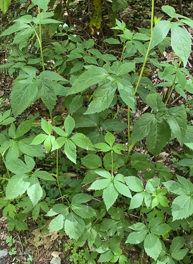 Leaves have 3 sharply and irregularly toothed (often lobed) leaflets, per Newcomb's Wildflower Guide (Newcomb, 1977).