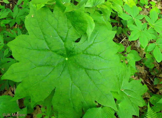 Flowering stem leaves are peltate near the margin and from 1 to 2' across, per Wildflowers of Tennessee (Carman, 2005).