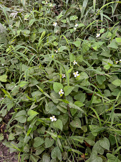 Chameleon-plant has heart-shaped leaves with impressed nerves. The flowers stand above the leaves, composed of a dense short spike of stamens and ovaries, subtended by 4 white petal-like bracts. This from Vascular Plants of North Carolina.