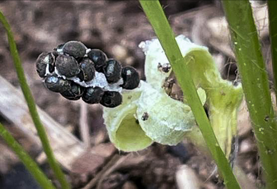 Seeds black beneath loose, iridescent, membranous coat, (1.3-) 1.4-2mm, with rounded pebbling, per Flora of North America.