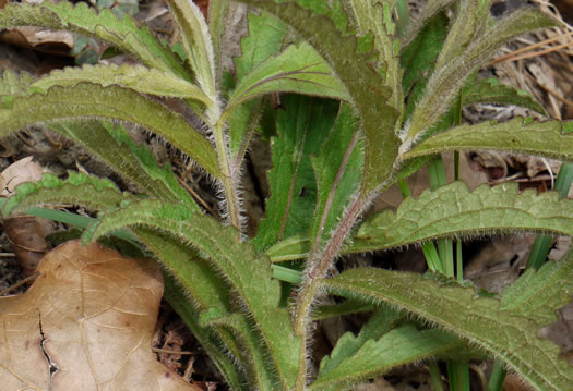 Hairy lower stem & coarsely toothed leaves with a tapering base, per Wildflowers of Tennessee, the Ohio Valley, and the Southern Appalachians (Horn, Cathcart, Hemmerly, & Duhl, 2005).
