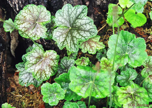 Heuchera usually has leaves as wide as long and with prominent variegation, per Weakley's Flora (2020).