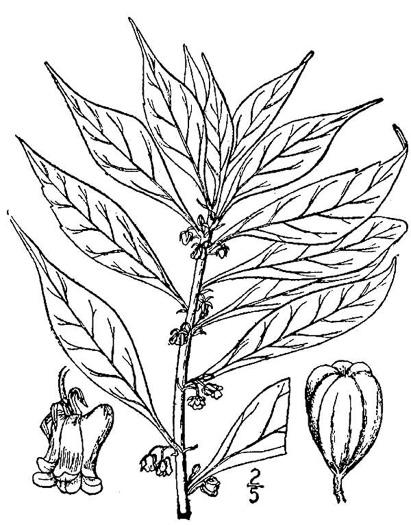 Small greenish flowers hang on short stalks from the axils, per Wildflowers of the Southern Mountains (Smith, 1998).