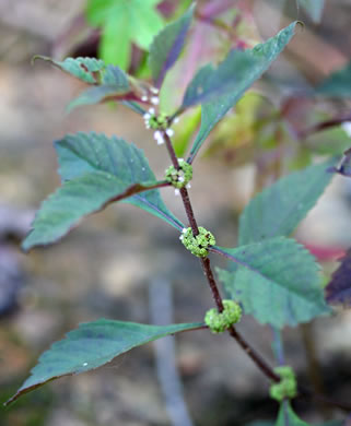 Flowers packed into small clusters in axils of widely-spaced pairs of leaves, per Wildflowers of the Southern Mountains (Smith, 1998).